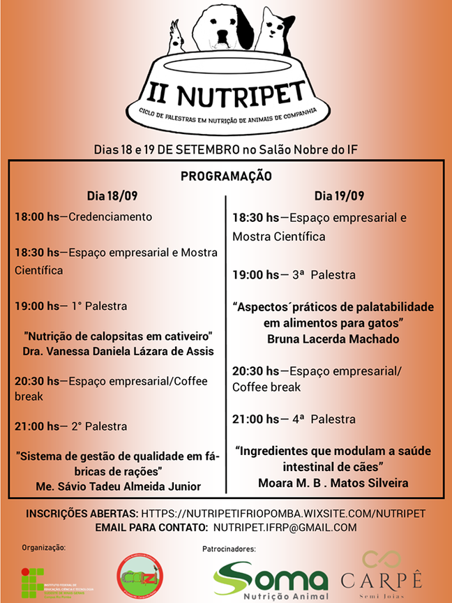 O I NUTRIPET – Ciclo de palestra em nutrição dos animais de companhia, foi promovido pelo Centro Acadêmico de Zootecnia e Departamento de Zootecnia do Instituto Federal de Educação, Ciência e Tecnologia do Sudeste de Minas Gerais - Campus Rio Pomba, em 2017. O evento permitiu inovações e troca de conhecimentos aos profissionais, estudantes e demais interessados na área, visando à nutrição dos cães e gatos.